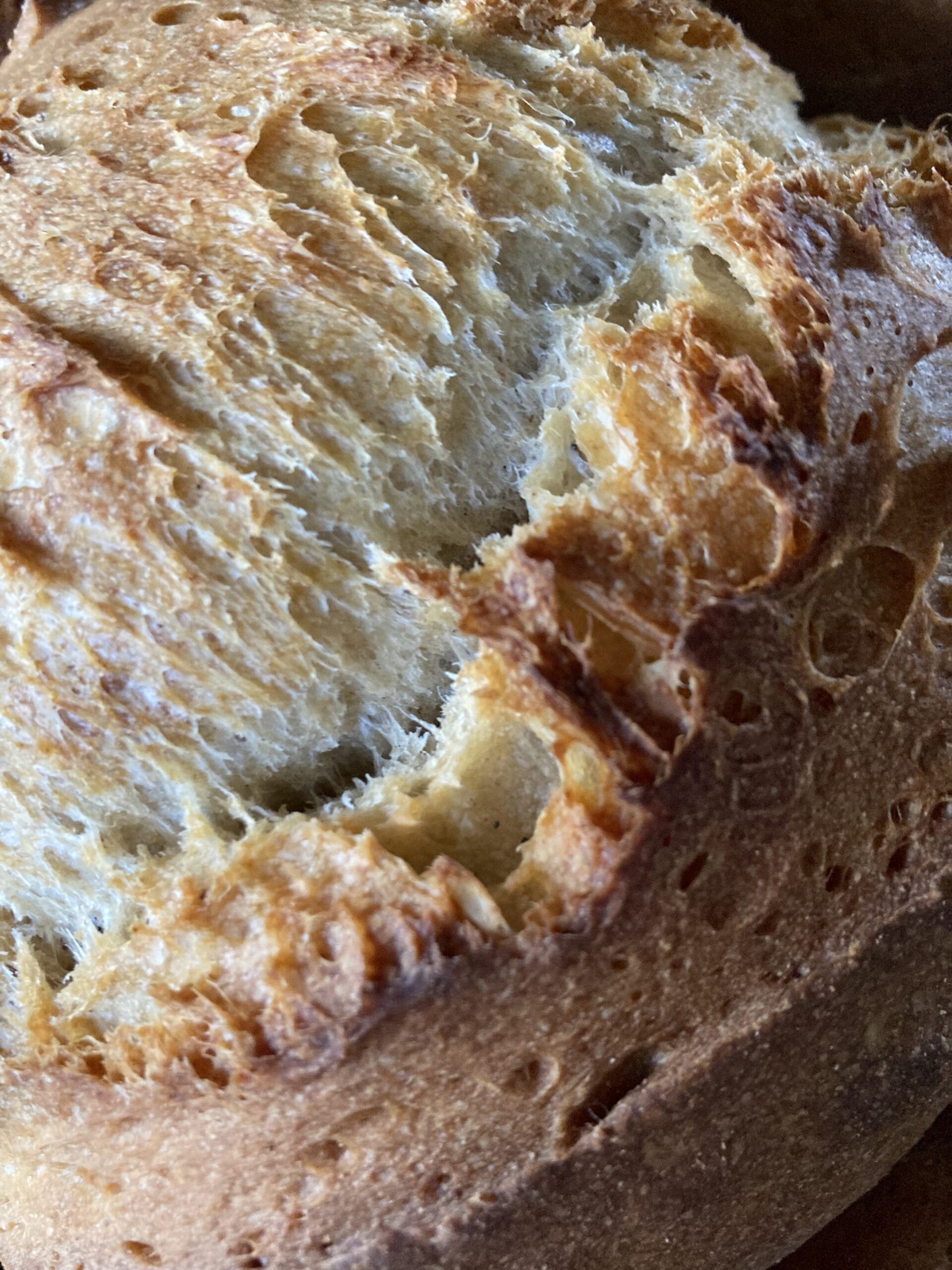 Ses céréales sont moulues à la meule de pierre, et elle les transforme en pain au levain naturel, pétri à la main, cuit au four à bois.