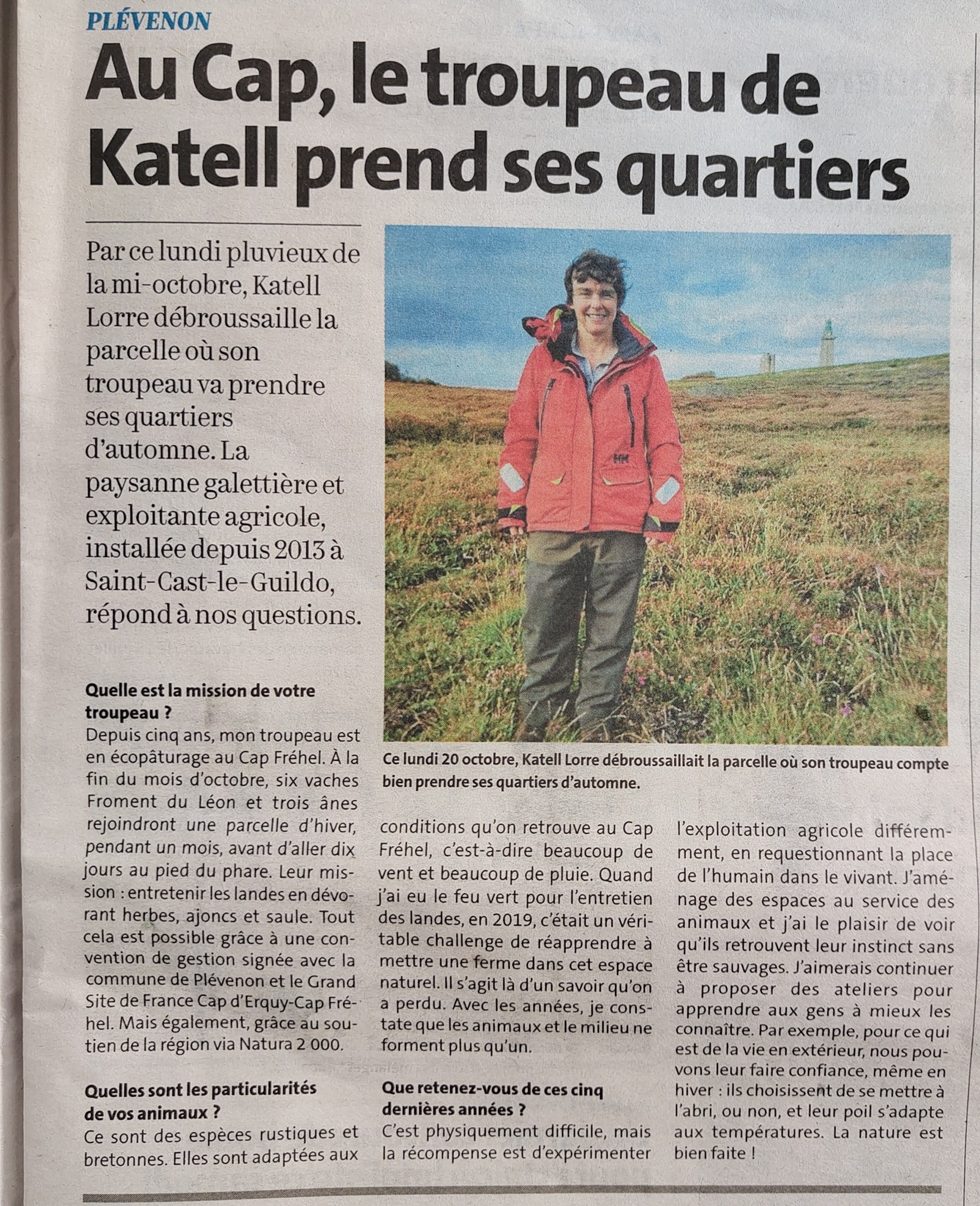 - dans Le Télégramme, le 24 octobre 2025 (Au Cap, le troupeau de Katell prend ses quartiers)