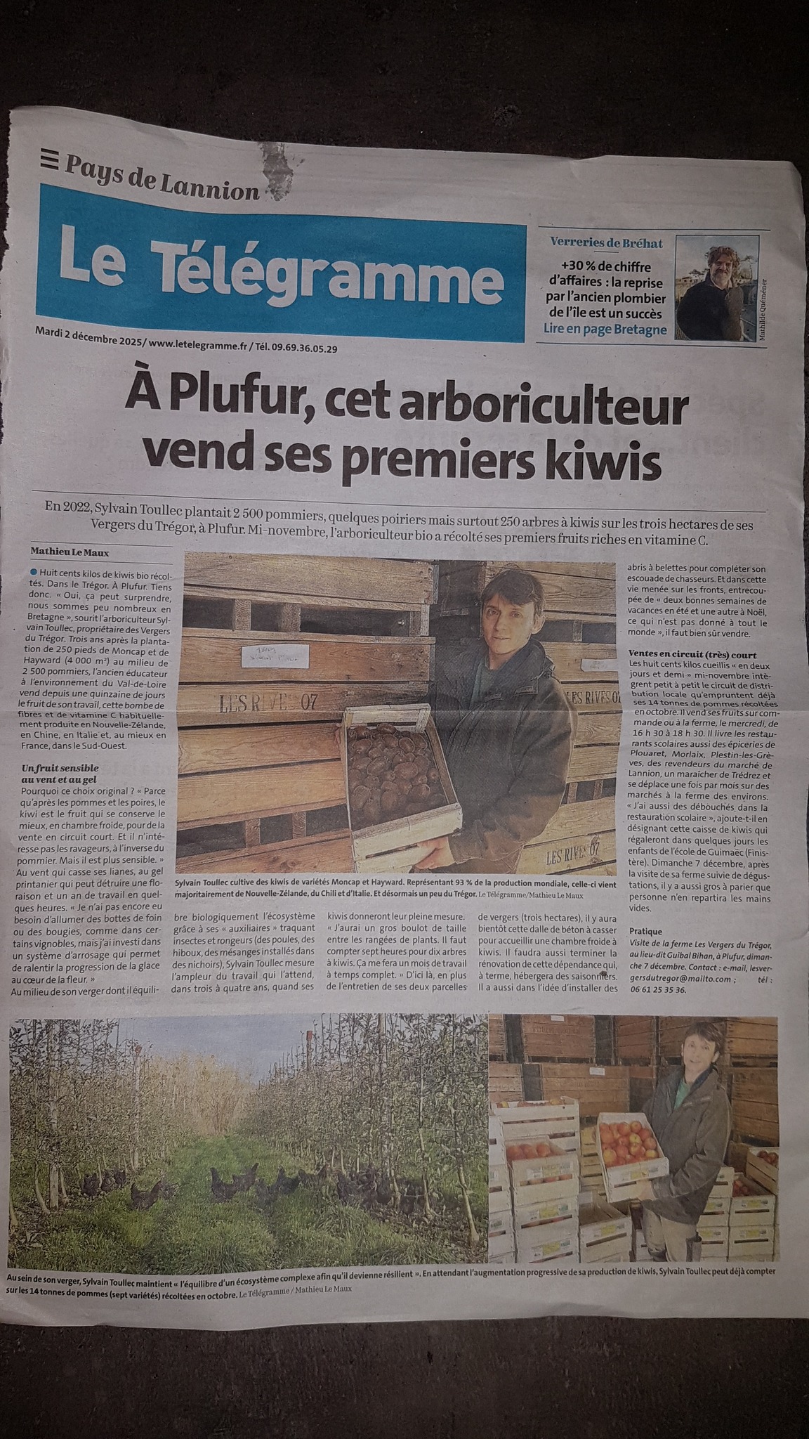 Sylvain produit des pommes (Reinette d'Armorique, Daliclass, Galiwa, Chailleux, Wellant, Opal, Pilot-Dalirene), des poires et des kiwis. Il a également un atelier de poules pondeuses, de races Bretonnes (Coucou de Rennes et Noires de Janzé), menées en poulaillers mobiles dans les vergers. Quelques ruches et Chèvres des Fossés complètent l'équipe pour assurer la pollinisation des vergers et l'entretien des parcelles !